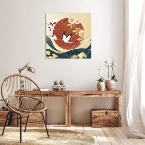 - Táto japonská kompozícia zobrazuje žeriavy na pozadí vĺn a červeného kruhu, inšpirovaná orientálnou estetikou. Perfektná voľba pre milovníkov tradičného umenia.
