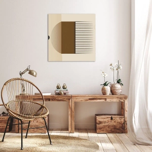 Kompozícia je založená na jasných geometrických tvaroch, ako sú čiary, kruhy a obdĺžniky, ktoré dodávajú obrazu moderný a minimalistický charakter. Farby, založené na prírodných odtieňoch béžovej a hnedej, vnášajú do interiéru pokoj a teplo a vytvárajú atmosféru priaznivú pre relaxáciu a reflexiu.