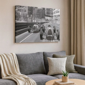 Obraz na plátne - Monochromatická scéna retro automobilových pretekov - 70x50cm - Kedysi dávno v Monte Carle - Moderná nástenná dekorácia do obývacej izby a spálne ARTTOR
