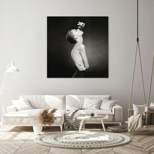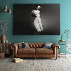 - Čiernobiela kompozícia zobrazujúca jemnú siluetu ženy držiacej kvet v ústach. Tento minimalistický obraz prináša eleganciu a harmóniu a dokonale dopĺňa moderné a umelecké interiéry.