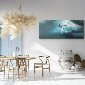 Postava surfera, viditeľná hlboko vo vlnách, symbolizuje odvahu a vášeň pre dobrodružstvo. Krištáľovo čistá voda a hra svetla a tieňa vytvárajú neuveriteľne realistický efekt, ktorý priťahuje pozornosť a inšpiruje. Pozadie obrazu s viditeľným oceánskym dnom dodáva kompozícii priestor a hĺbku.