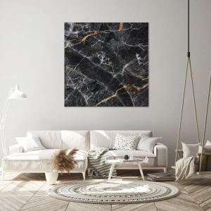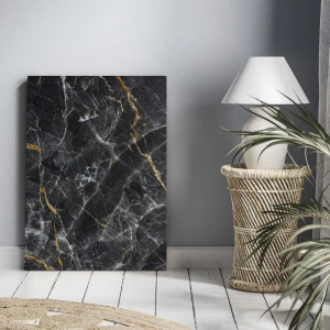 Mramor, symbol elegancie a triedy, predstavuje na obrázku svoju prirodzenú štruktúru, zvýraznenú zlatými detailmi. Kontrast medzi sýto čiernou a jemnými odleskami zlata dodáva dielu jedinečný charakter, vďaka čomu je perfektným doplnkom minimalistických, moderných alebo očarujúcich interiérov.
