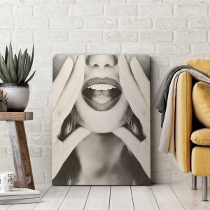 - Obraz zobrazuje ženu v čiernej a bielej farbe s výraznými ústami a rukami na tvári. Minimalistický a elegantný štýl obrazu dodáva umelecký nádych.