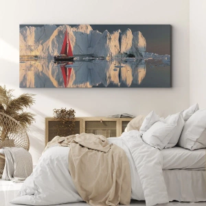 - Obraz zobrazuje plachetnicu s červenou plachtou na pozadí pôsobivého ľadovca, ktorý sa odráža v pokojnej vode. Úchvatná krajina s harmonickou estetikou, ktorá prináša do interiéru pokoj a krásu prírody.