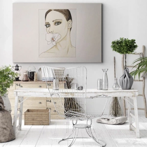 - Obraz zobrazuje portrét ženy s orchideou v ústach, vyhotovený v jemných farbách, ideálny do interiérov v minimalistickom a elegantnom štýle.