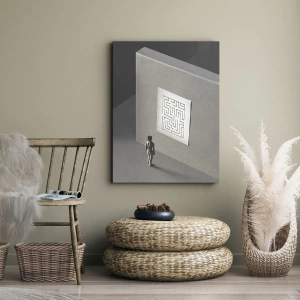 - Minimalistický obraz zobrazujúci postavu v labyrinte, ktorá sa pozerá na zavesenú mapu. Symbolika stratenosti a hľadania cesty von prináša do interiéru reflexiu a harmóniu. Ideálny do moderných interiérov.