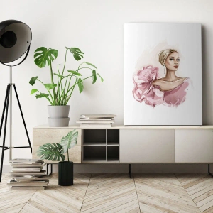 - Elegantný portrét ženy v ružových šatách na svetlom pozadí. Minimalistický štýl a jemné detaily prinášajú do interiéru harmóniu a sofistikovanosť. Ideálna voľba pre moderné interiéry.