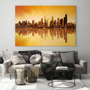 Architektúra mesta, zobrazená v zlatých tónoch, symbolizuje modernosť a štýl. Odraz mrakodrapov vo vode dodáva hĺbku a jedinečnosť a vytvára mimoriadny vizuálny efekt. Tento obraz sa dokonale hodí do priestorov, ako je obývačka, kancelária alebo spálňa, a dodá im eleganciu a sofistikovanosť.