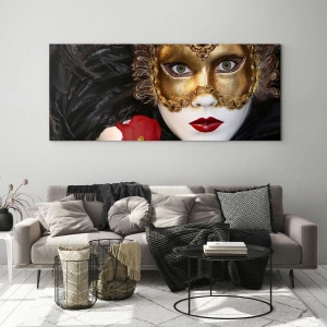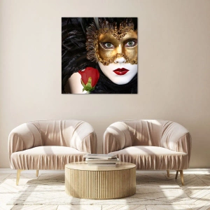 - Obraz zobrazuje zlatú karnevalovú masku s červenou ružou, čím vytvára elegantnú a tajomnú kompozíciu. Dokonalá dekorácia pre tých, ktorí si cenia originalitu a štýl.