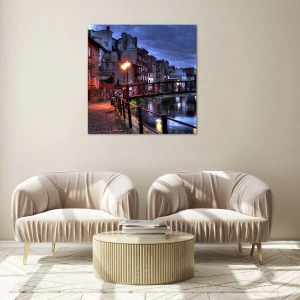 - Očarujúca ulica s kanálom, mostom a atmosférickým večerným osvetlením. Táto sklenená tlač s rozmermi 70x50 cm je ideálna do nostalgických a romantických interiérov.
