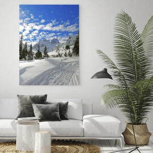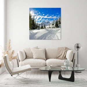"V snehu a slnku" je obraz, ktorý prináša do interiéru jedinečnú atmosféru zimného pokoja. Zobrazuje malebnú horskú krajinu so zasneženým lesom, jasnou zasneženou cestou a modrou oblohou, ktoré spolu vytvárajú kompozíciu plnú harmónie a krásy. Svetlo odrážajúce sa od snehu zvýrazňuje detaily a majestátne hory v pozadí dodávajú hĺbku a priestor.