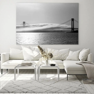 Nástenný obraz - Plavba cez Zlatú bránu - Most v čiernobielej farbe s hmlou nad vodou