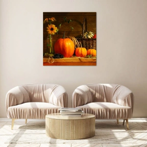 • Tekvica, Slnečnice, Zátišie, Gastronómia, kvety, Do jedálne, do kuchyne Hnedá, oranžová, Štvorcový