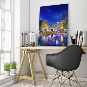 Sklenený obraz "Panoráma mesta v noci so svetlami odrážajúcimi sa vo vode" je veľkolepým zobrazením mestskej krajiny. Motív zobrazuje osvetlené budovy a mrakodrapy v noci, ktorých svetlá sa odrážajú na pokojnej vodnej hladine a vytvárajú tak harmonickú a dynamickú kompozíciu.