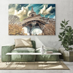 Jesenné farby listov v kontraste s kovovou konštrukciou Eiffelovej veže zdôrazňujú jedinečnosť kompozície a prinášajú do interiéru teplo a inšpiráciu. Detaily, ako je tvar oblakov a textúra stromov, boli reprodukované s maximálnou presnosťou, čo dodáva obrazu jasnosť a hĺbku.