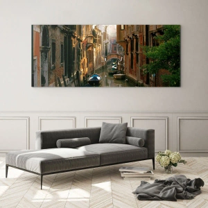 - Umelecká sklenená maľba zobrazujúca benátsky kanál obklopený historickými budovami. Atmosférická kompozícia plná šarmu a romantiky.