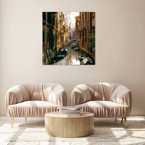 Sklenený obraz s názvom „V benátskej uličke“ zobrazuje malebný benátsky kanál, obklopený historickými činžovnými domami a zdobený loďkami, ktoré pokojne plávajú po vode. Táto jedinečná scenéria, plná teplých farieb a stredomorskej atmosféry, nás prenesie do srdca Benátok, mesta plného histórie a romantiky.