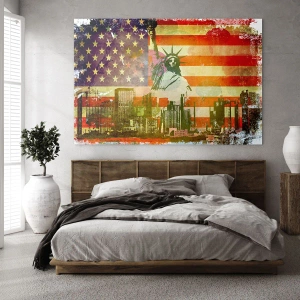Nástenné umenie - Viva America! - Vlajka USA so siluetou Sochy slobody a mestskou krajinou