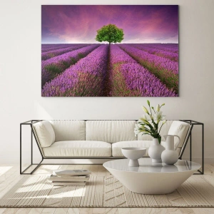 - Tento obraz zobrazuje malebné levanduľové pole s osamelým stromom na pozadí žiarivej oblohy, čo scéne dodáva pocit harmónie a pokoja. Je ideálny do rustikálnych a minimalistických interiérov a dodáva nádych prírodnej krásy.