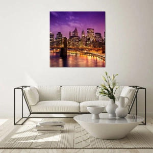 Sklenená umelecká tlač „Fialový a zlatý Manhattan“ je štýlová dekorácia, ktorá vás prenesie do srdca jedného z najikonickejších miest sveta. Ústredným prvkom je Brooklynský most, tiahnuci sa nad vodou, s pôsobivou panorámou osvetlených mrakodrapov na pozadí nočnej oblohy. Fialové a modré odtiene večernej oblohy zdôrazňujú moderný charakter kompozície a vytvárajú nezabudnuteľnú atmosféru.