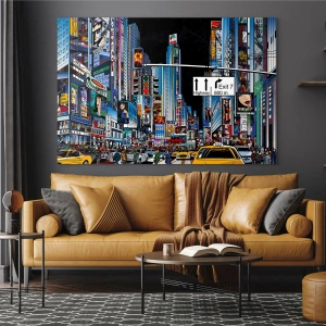 Obraz „Rušná ulica so žltými taxíkmi a neónovými nápismi“ je dynamická kompozícia zobrazujúca pulzujúci život metropoly. Farebné neónové nápisy, žlté taxíky a ruch ulice vytvárajú jedinečnú atmosféru mestského ruchu, ktorá dokonale ladí s atmosférou veľkých miest, ako je New York. Intenzívne farby a detaily obrazu priťahujú pohľad a vnášajú do interiéru energiu a modernosť.