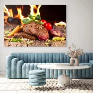 Obraz je vyrobený z najkvalitnejšieho skla a dokonale reprodukuje detaily, ako je textúra steaku, farby zeleniny a intenzita plameňov. Sklenený povrch zdôrazňuje hĺbku farieb, čím dodáva celému dielu osobitý a elegantný vzhľad.