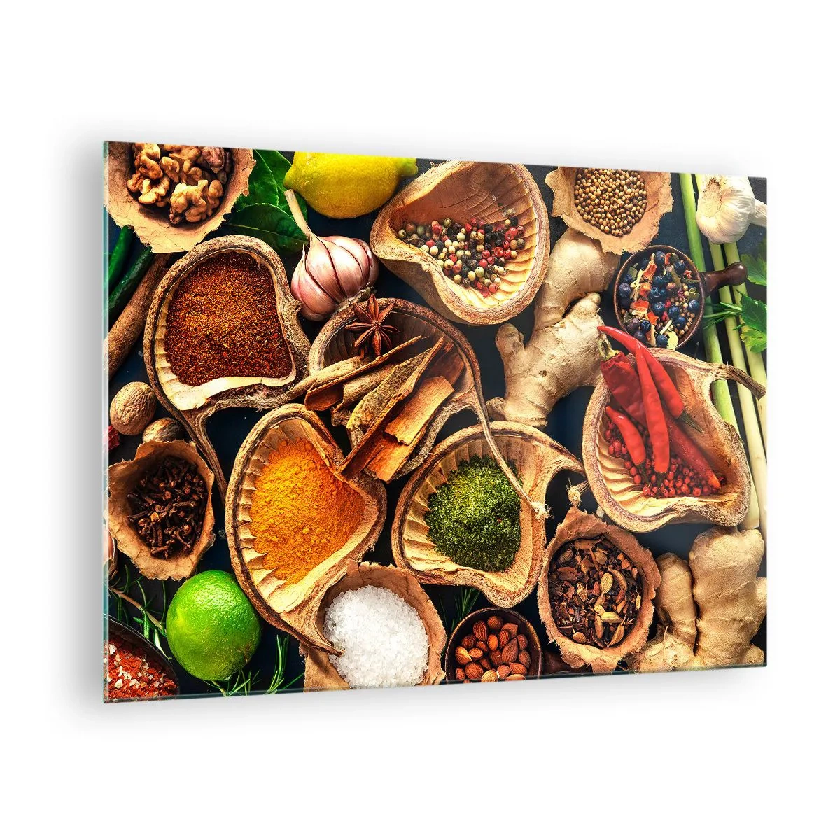 Obraz je vyrobený z najkvalitnejšieho skla a zvýrazňuje detaily a intenzitu korenín, ako je červená paprika, žltá kurkuma a zelená petržlenová vňať. Prírodné nádoby dodávajú kompozícii autentickosť a teplý, rustikálny charakter, čím do interiéru vnášajú jedinečnú atmosféru.