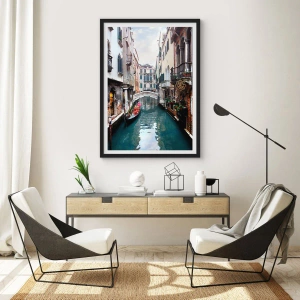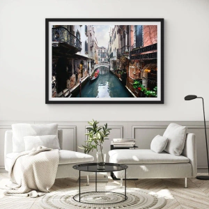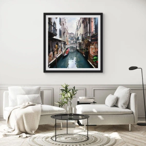 Plagát v čiernom ráme - Benátska krajina s gondolou a mostíkom - 40x40 cm