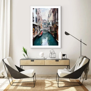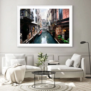 Plagát v bielom ráme - Benátska krajina s gondolou a mostíkom - 70x100 cm