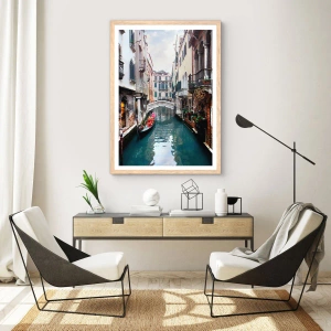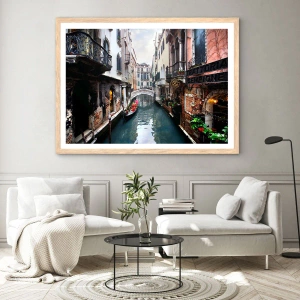 Plagát v ráme zo svetlého duba - Benátska krajina s gondolou a mostíkom - 100x70 cm
