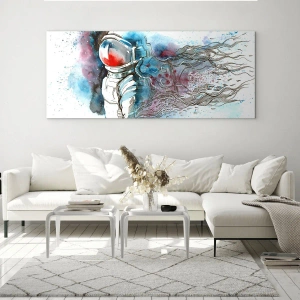 - Umelecká kompozícia zobrazujúca astronauta v dynamickom kozmickom prostredí, vykreslená akvarelom. Unikátna dekorácia, ktorá evokuje atmosféru galaktického priestoru.