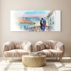 - Tento obraz zobrazuje pár na balkóne pri západe slnka, namaľovaný umeleckým akvarelovým štýlom. Jemná dekorácia ideálna pre milovníkov romantických tém.