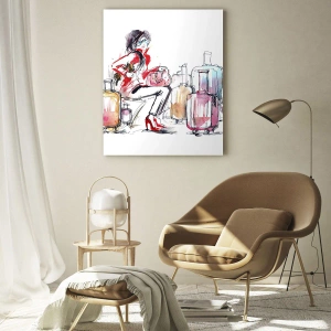 Tvorcovia obrazu čerpali inšpiráciu z cestovania a módy, čo je jasne viditeľné v kombinácii ženskej siluety a motívu kufra. Červený kabát a farebné detaily kufrov dodávajú celku energiu a optimizmus a zdôrazňujú moderný charakter diela. Táto harmonická kombinácia umenia a každodenných tém určite osloví milovníkov štýlu a kreatívnych dekorácií.