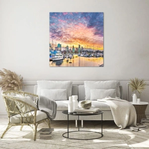 - Tento sklenený obraz zobrazuje západ slnka nad prístavom s loďami a mrakodrapmi. Ideálny do moderného a relaxačného interiéru.