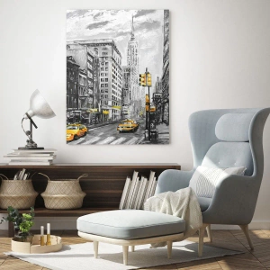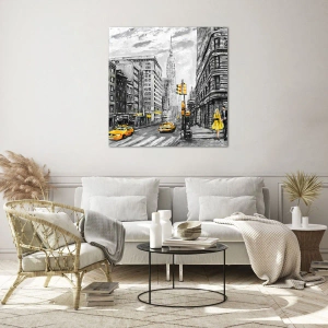 Obraz zobrazuje New York v odtieňoch čiernej a bielej s výraznými žltými akcentmi v podobe taxíkov a šiat zamilovaného páru. Mestská scenéria je plná života a dynamického pohybu, čo dodáva obrazu moderný charakter.