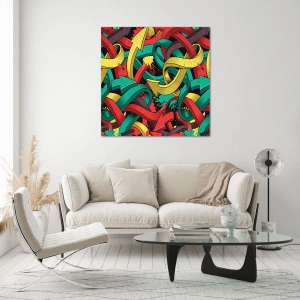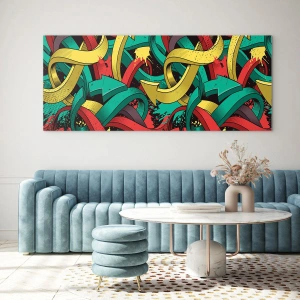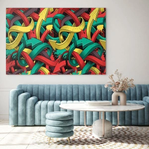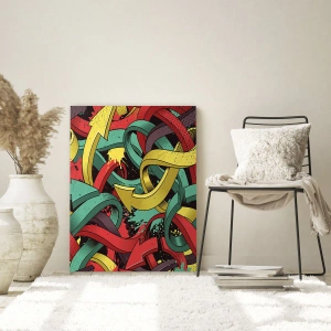 - Obraz zobrazuje abstraktnú kompozíciu plnú farebných, prepletených šípov v dynamickom aranžmáne. Intenzívne farby a pohyb dodávajú dielu energický a moderný charakter.