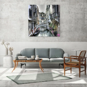 - Obraz zobrazuje malebný benátsky kanál s prechádzajúcou gondolou. Okolité mestské domy, most a kvety vytvárajú romantickú a atmosférickú atmosféru talianskeho mesta.