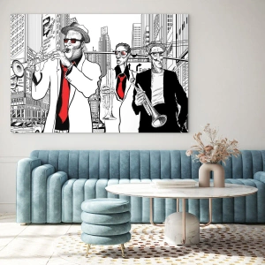 - Toto umelecké dielo zobrazuje jazzovú pouličnú kapelu v grafickom štýle s dynamickými líniami a červenými akcentmi. Je to perfektná dekorácia pre milovníkov hudby a moderného dizajnu.