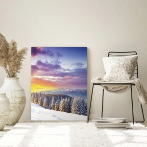 - Malebná zimná horská krajina so zasneženými stromami a farebnou oblohou. Dokonalá dekorácia, ktorá vnesie harmóniu a pokoj do každého interiéru.