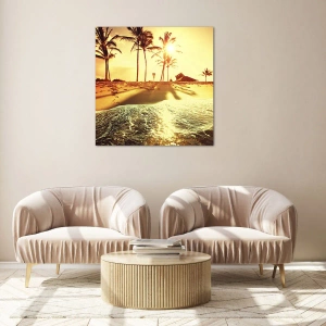 - Zlatá pláž s palmami pri západe slnka, ktorá vytvára atmosféru relaxu a exotiky. Dokonalý obraz na skle, ktorý rozžiari každý interiér.