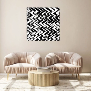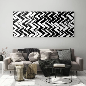 - Čiernobiely cikcakový vzor s dynamickou kompozíciou a expresívnou textúrou. Táto sklenená tlač dodáva moderný a grafický charakter každému interiéru.