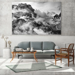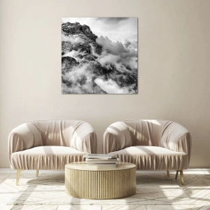 - Sklenený obraz zobrazujúci monumentálne hory v čiernobielej farbe s hmlou vznášajúcou sa v údoliach. Dokonalá dekorácia, ktorá prinesie pokoj a harmóniu.