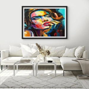 Plagát v čiernom ráme - Výrazný, farebný portrét ženy v expresívnom štýle. - 50x70cm - Sny, ako vtáky letia oblohou - Moderná nástenná dekorácia do obývacej izby a spálne ARTTOR