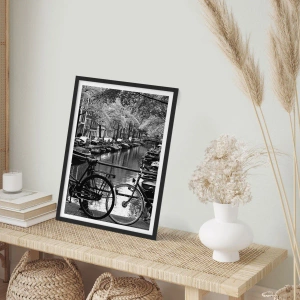 - Tento čiernobiely plagát zobrazuje malebný amsterdamský kanál s bicyklami vystavenými v popredí. Ideálny do minimalistických alebo klasických interiérov. Plagát má čierny rám.