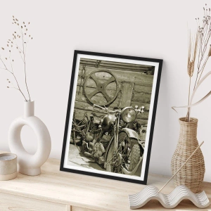 Plagát v čiernom ráme - Starý motocykel v drevenej kôlni s kolesom v pozadí - 50x70cm - V kôlni strýka Mariána - Moderná nástenná dekorácia do obývacej izby a spálne ARTTOR