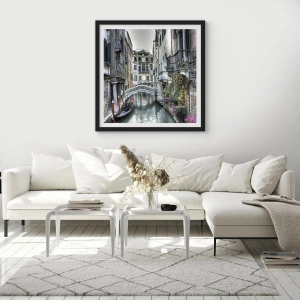 - Tento plagát zobrazuje malebný kanál v Benátkach s gondolou a mostom v pozadí. Ideálny do klasického alebo romantického interiéru. Plagát s rozmermi 50 x 70 cm je dodávaný s elegantným čiernym rámom.
