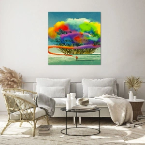 - Táto sklenená tlač s rozmermi 70x50 cm zobrazuje farebnú explóziu dymu obklopujúcu osamelý strom na pozadí modrej oblohy. Ideálna do interiérov hľadajúcich výrazné akcenty a inšpiráciu.