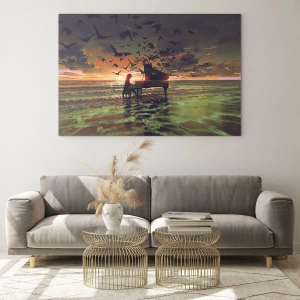 Ponorte sa do magickej atmosféry s touto jedinečnou sklenenou umeleckou tlačou. Zobrazuje romantickú scénu, v ktorej klavirista hrá na klavíri na pláži, zatiaľ čo slnko pomaly zapadá za horizont. Vlny jemne obmývajú pobrežie a vtáky sa vznášajú na oblohe, čo dodáva kompozícii dynamický a poetický nádych.