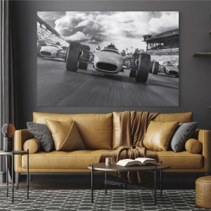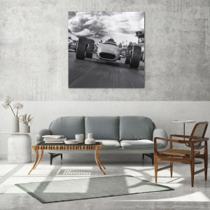 • Formula 1, vozidlo, preteky, Čierna a biela, Automotive, Sport and Hobby, Vintage a retro, Do kancelárie, Do pracovne, Do jedálne, Do haly, Do obývačky, Šedá, čierna a biela, Štvorcový