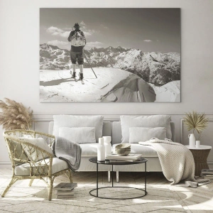 Nástenný obraz - A hory sú rovnaké - Lyžiar na vrchole hory v čiernobielej farbe